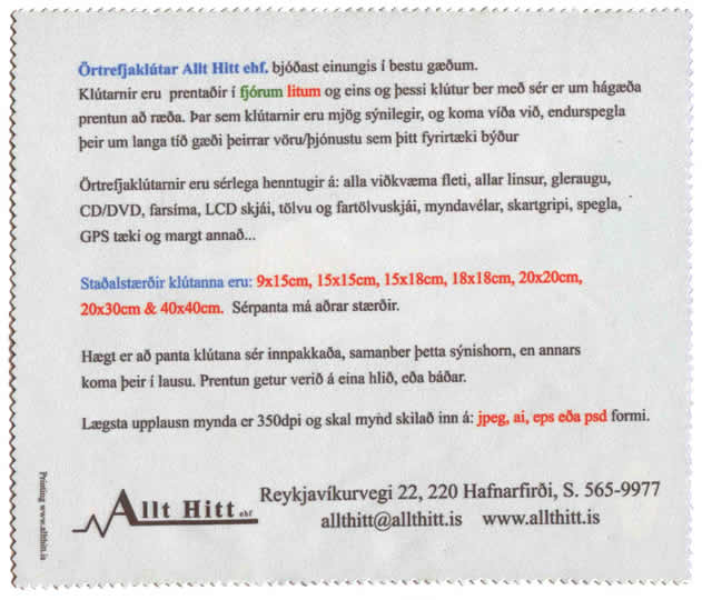 mynd af örtrefja-klút Allt Hitt ehf. að aftanverðu.